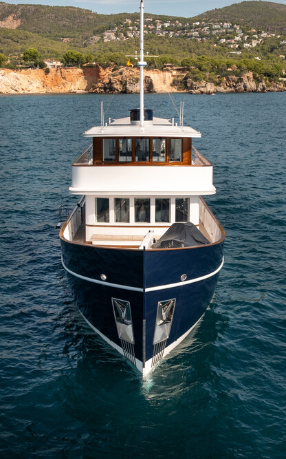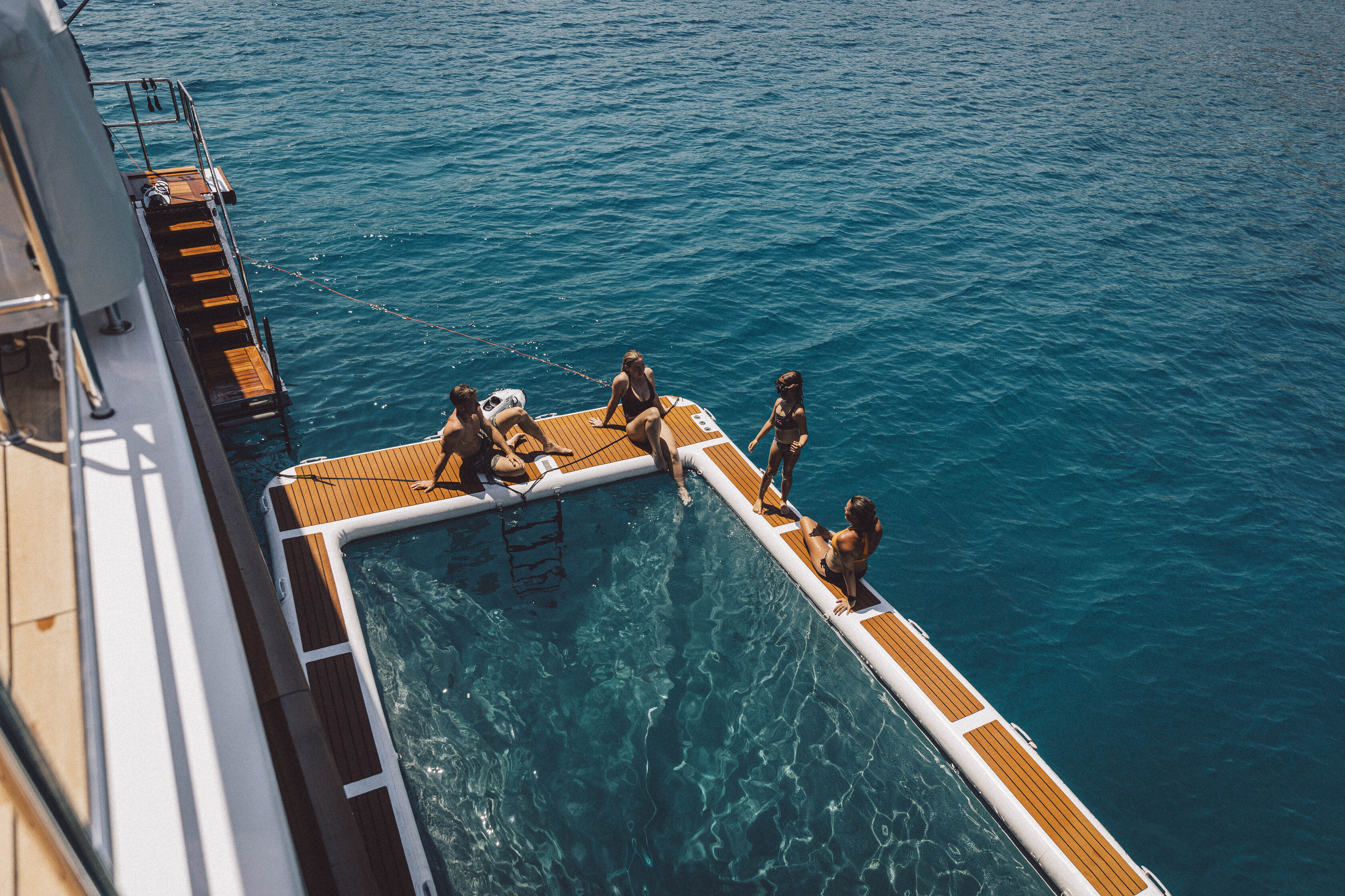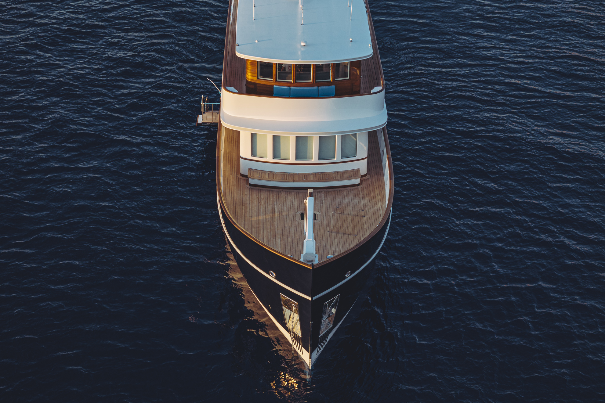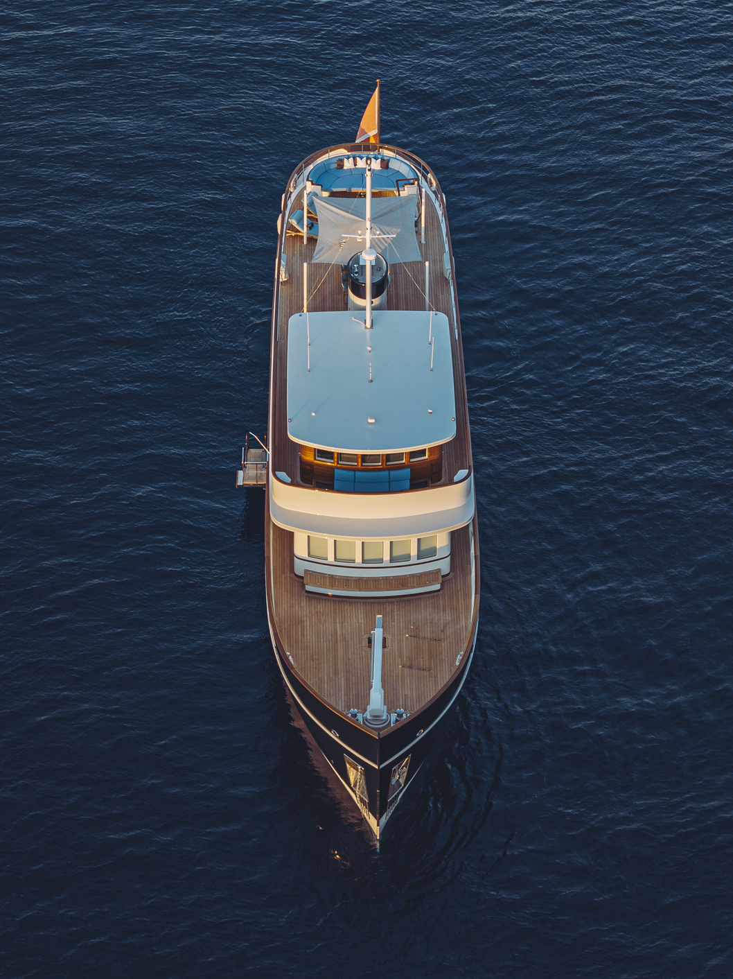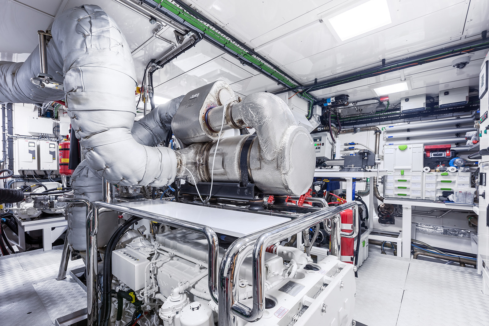 As well as the fold-out hydraulic side boarding steps to starboard, access onboard is also possible through the beautifully styled canoe stern transom. Here the transom lowers to allow access onboard via a telescopic passerelle.