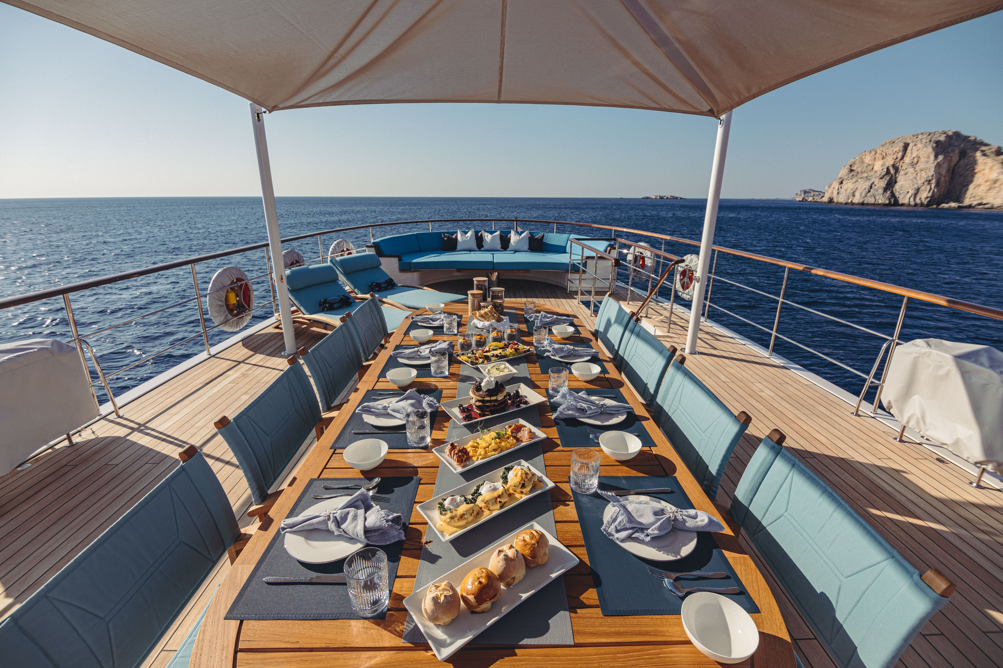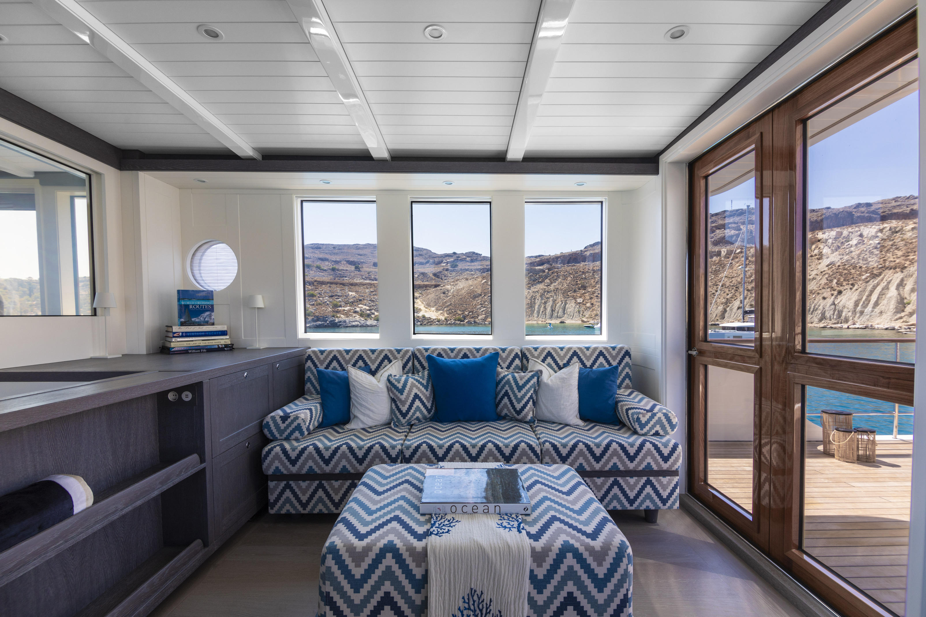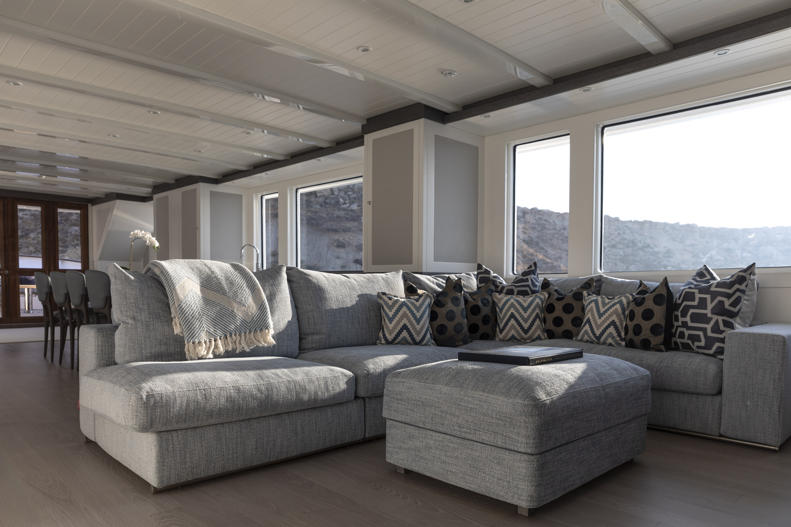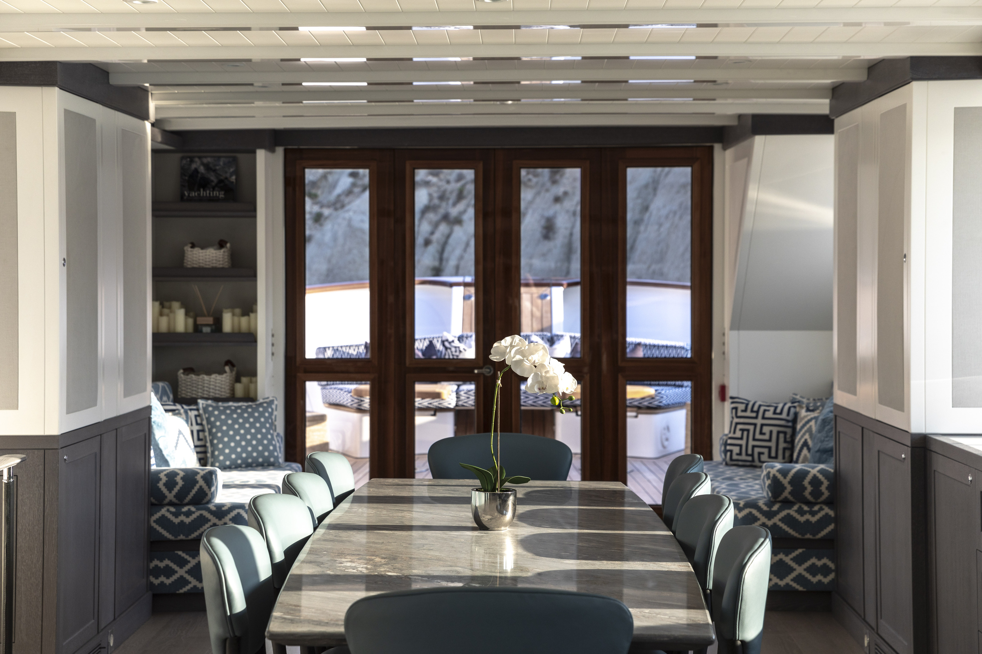 Far Niente’s spacious main deck saloon is accessed through the twin opening varnished wooden doors aft. This large open plan saloon/dining area is superbly lit along the length of the room on both sides due to the copious amount of large pane windows either side. As a result the views across the anchorage are quite exceptional. The beautiful marble topped dining table seats 10 with ease and is central to the room. Here you can really appreciate the excellent views this room affords. Forward of the dining area is a sumptuous cosy lounging area with long L shaped sofa and ottoman. This is the ideal place to kickback and relax in front of the 50” television which has Sonos surround sound and is connected to the ships Starlink. Guests are free to stream as desired on demand.