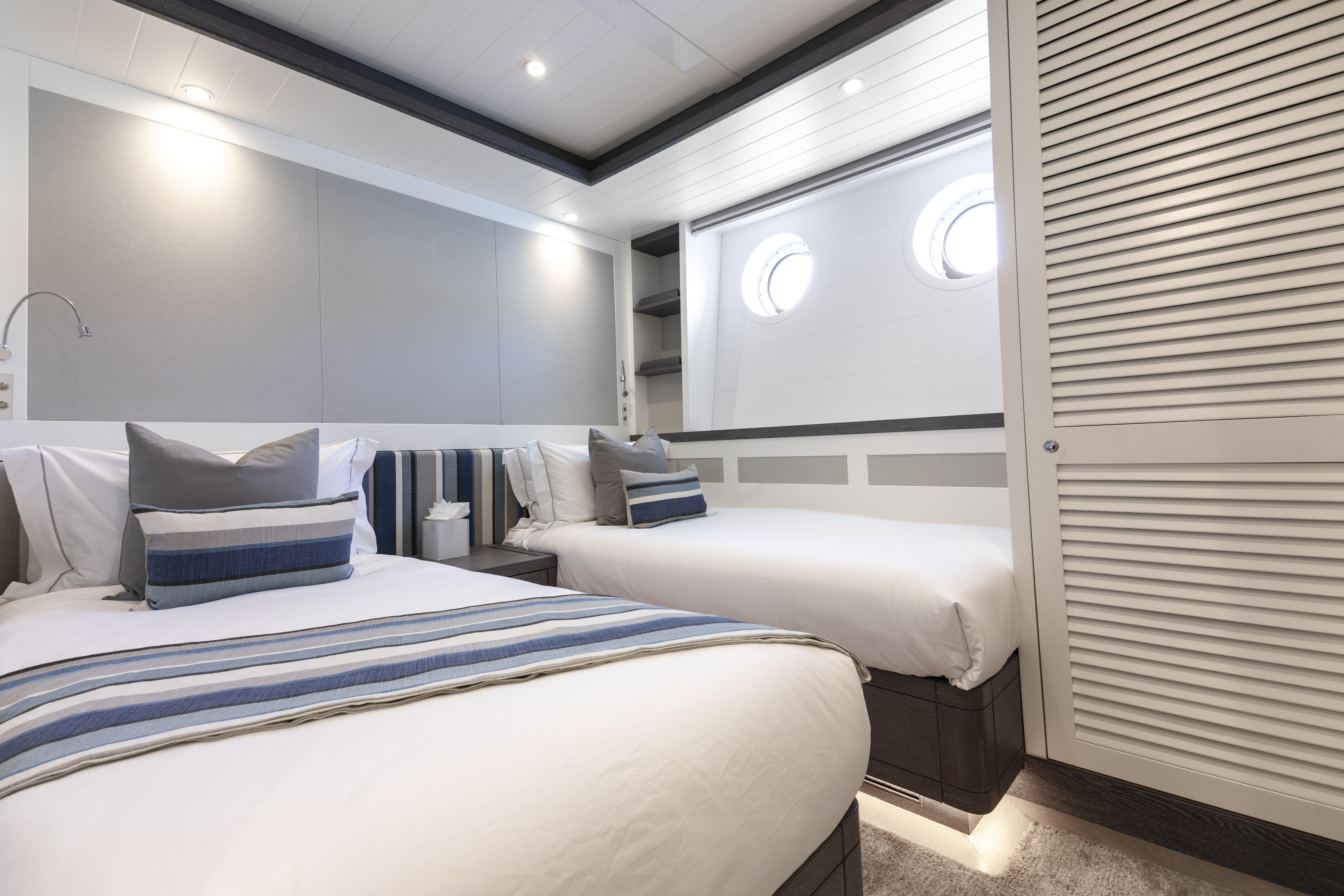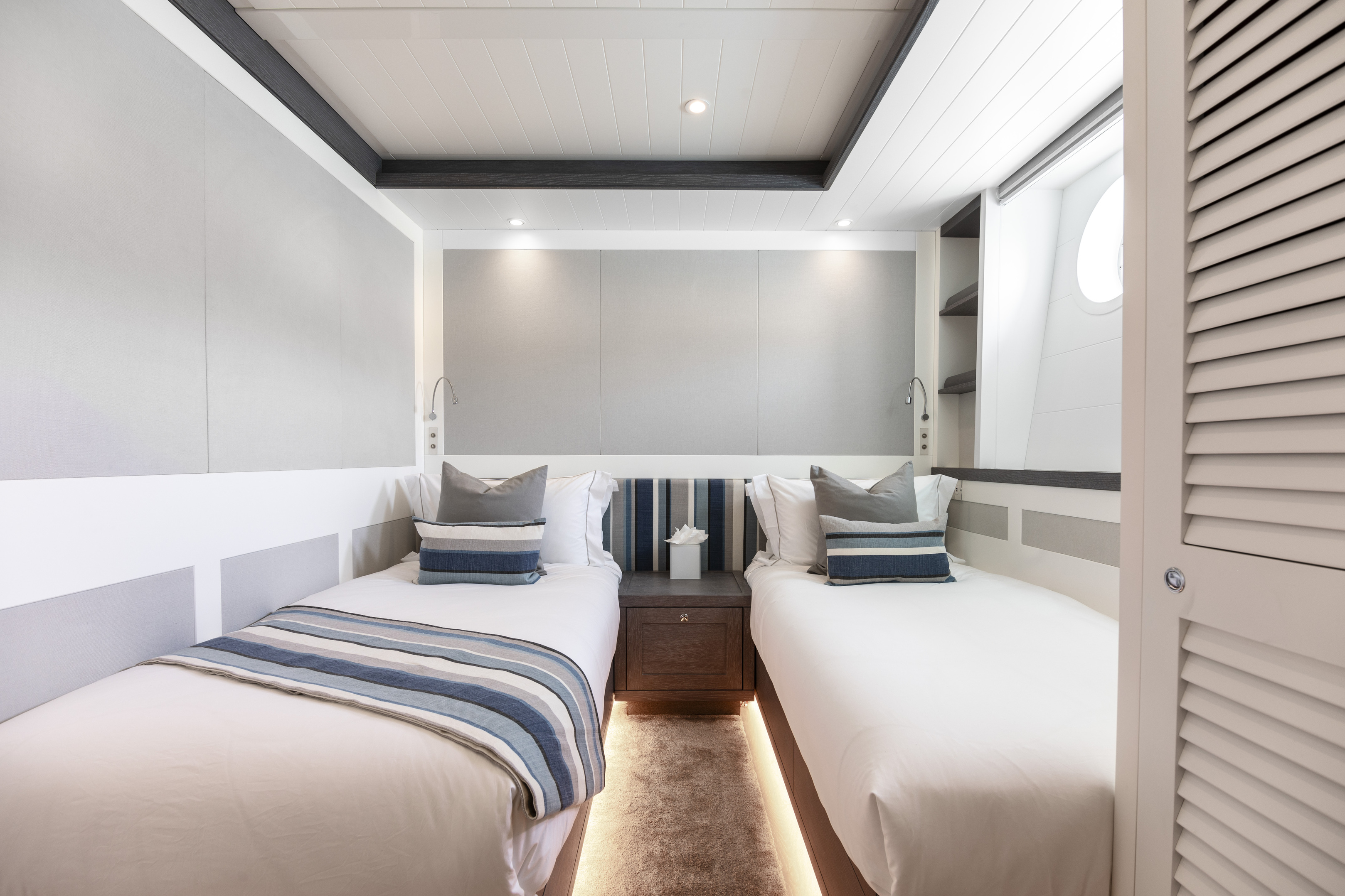 Below decks, and accessed via the central stairs in the saloon, are the remaining guest cabins. Here there are 4 x cabins sleeping 8 guests in total. Two of the cabins have permanent double beds with their own spacious bathrooms. The other two remaining cabins are twin single bed cabins which can also be pushed together to create double beds if required. These cabins are beautifully appointed and very much to the same styling as the owners cabin. They also have adjoining bathrooms.