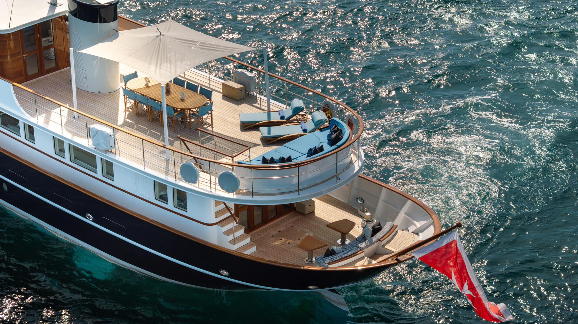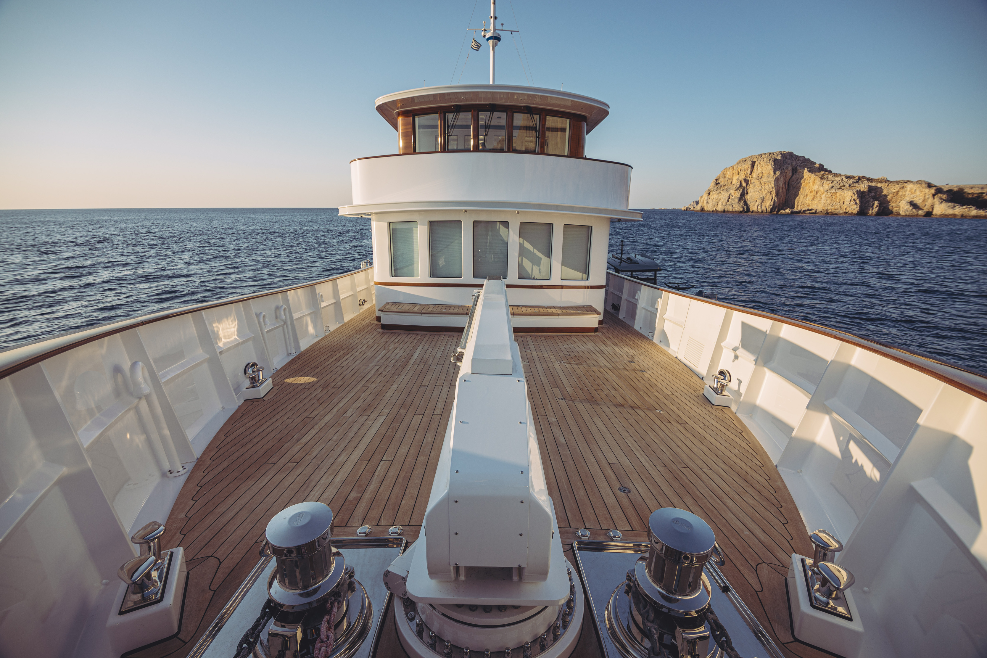 Of real note are the hand crafted mahogany varnished doors which take you out onto the expansive teak laid aft deck. This open plan deck is a wonderful feature of Far Niente and very much the beating heart of the yacht during the day. The deck is well shaded by a large suspended awning which has an al-fresco teak dining table and 10 chairs under. There is also a very large halfmoon sunpad aft and 2 x reclining teak steamer chairs in which to enjoy. Take a walk and forward of the beautifully varnished pilothouse you find a secluded gem – a Portuguese bridge which offers private seating and protection from the elements, thanks to the high bulwarks and teak cap rail.