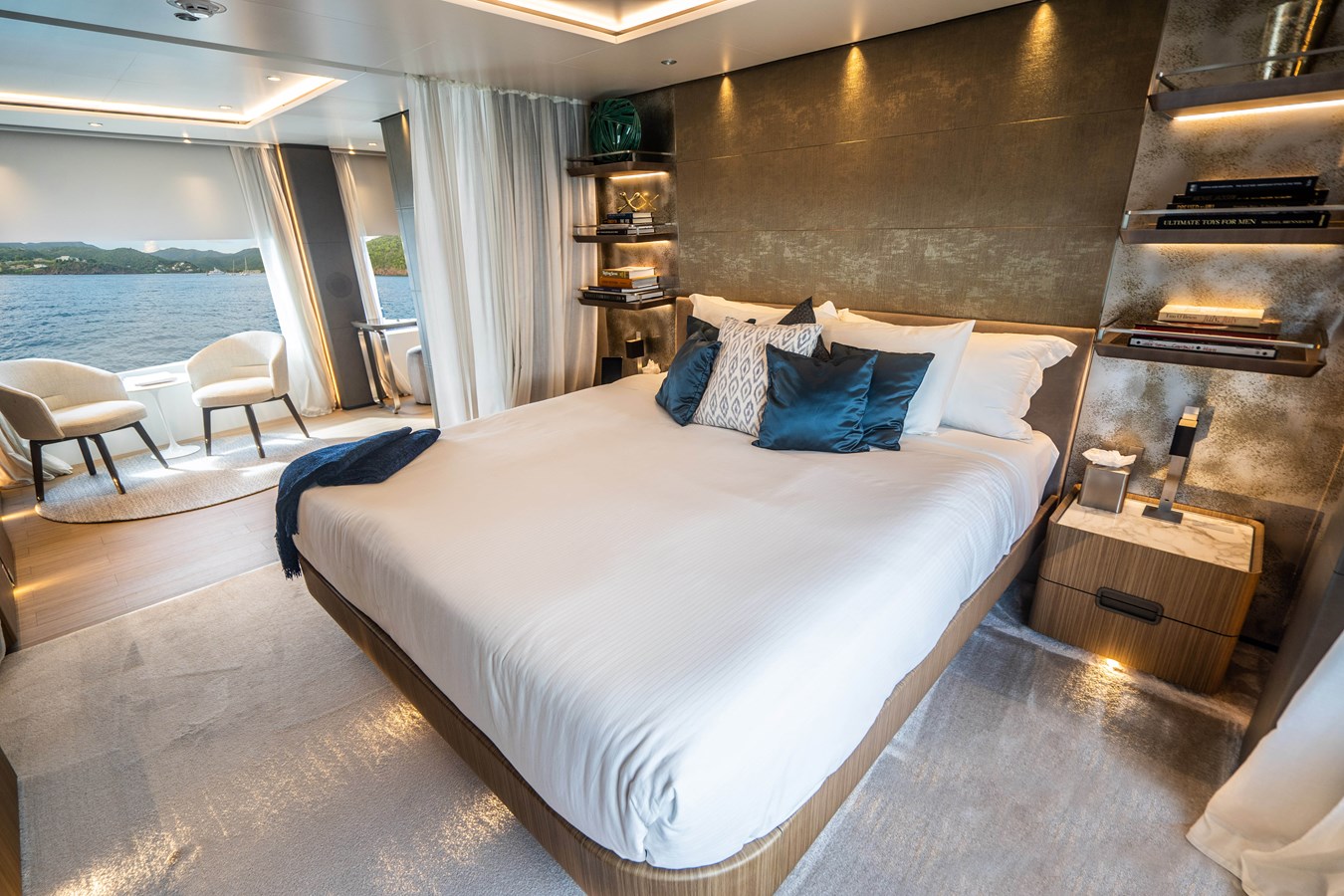Luxury abounds in the carefully crafted master suite. Enter the master suite with a true walk-in closet to port and office desk topped in glass to starboard. The master lounge area comfortably rests forward of the office space. Light beams into the master suite across the king-size bed through generous port and starboard glazing. Bronze Travertino marble brings elegance to the beautiful oversized sun shower with built-in bench positioned between his and her marble counter wash basins. His and her toilets and bidets each located to port and starboard beam allows for comfort and privacy.