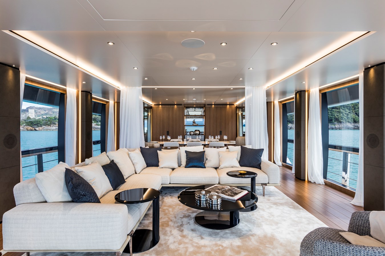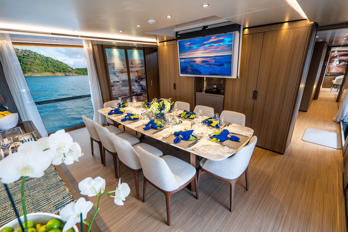 Six full length windows adorn the salon creating a natural connection between internal and external worlds. An L-shaped sofa by Poltrona Frau faces aft where guests enjoy the full beam view. Our drop down rotational flat screen TV is perfect for movie night. Twin swivel armchairs by Minotti and matching glass coffee tables complement the sofa.