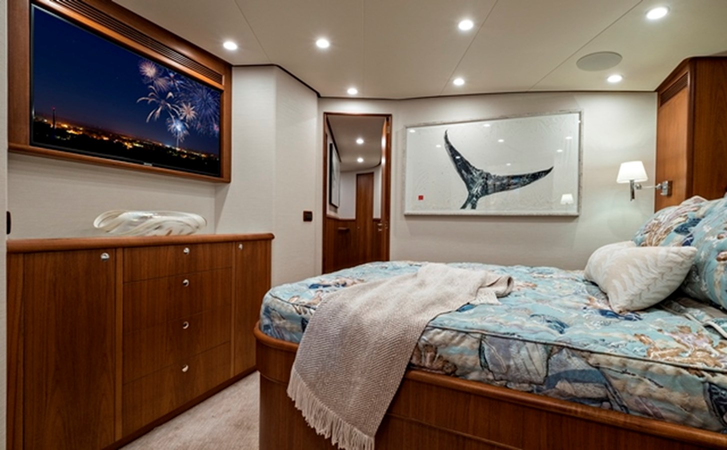 Teak cabinet, housing Smart TV, is located on the forward bulkhead