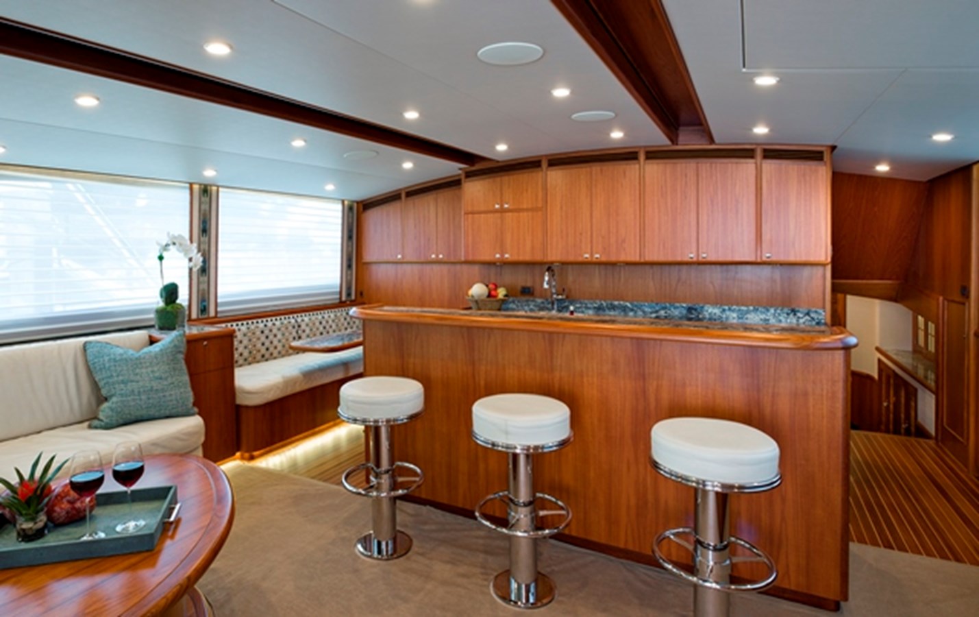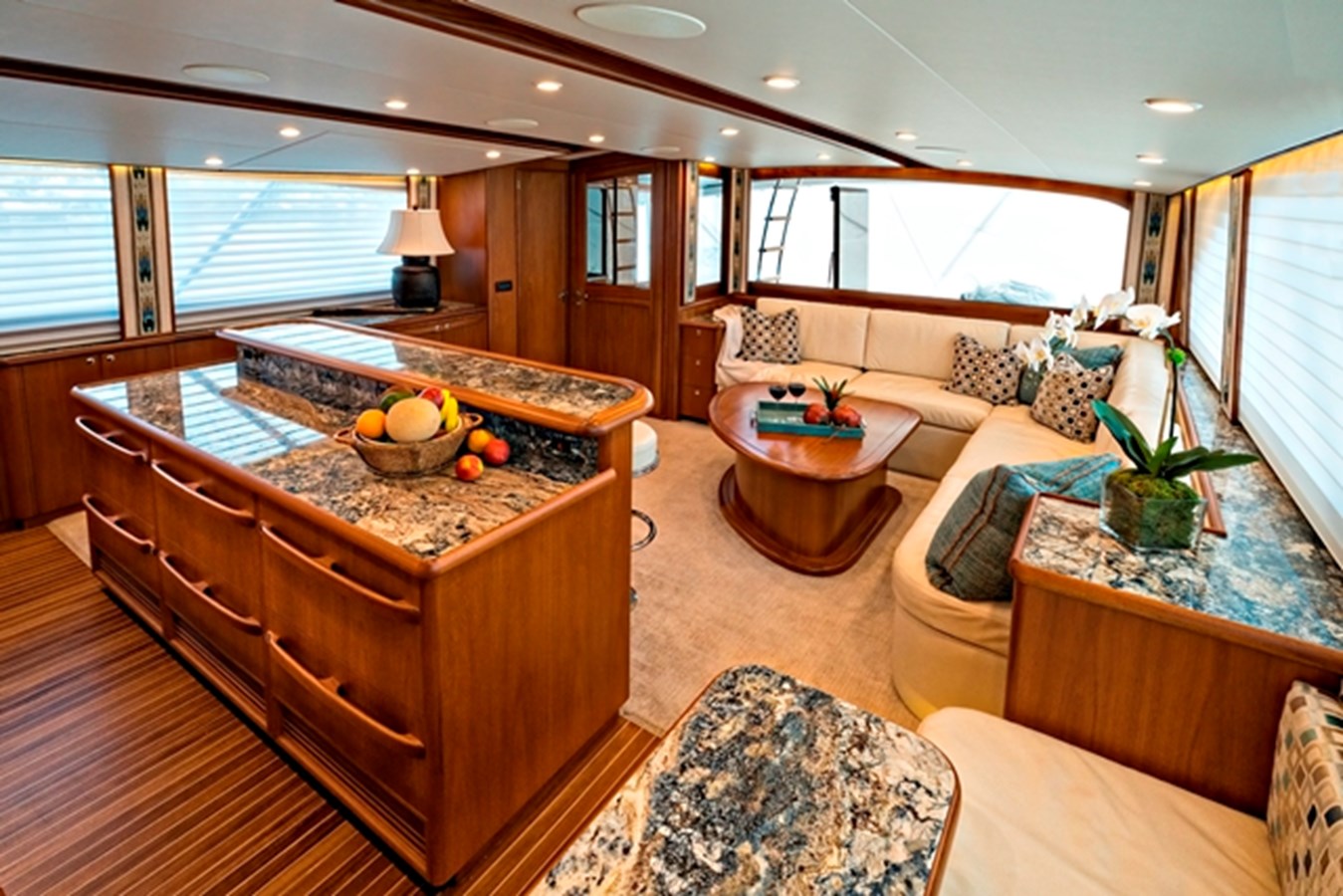 Galley island/bar in center of salon, with forward facing stools