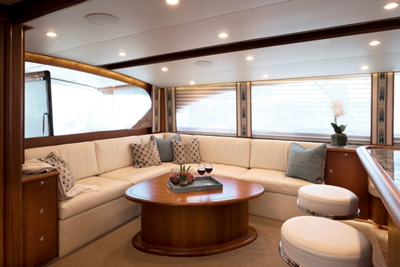 Dinette is forward to port, with teak and granite table and seating for four