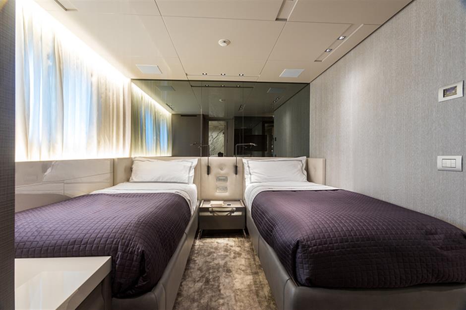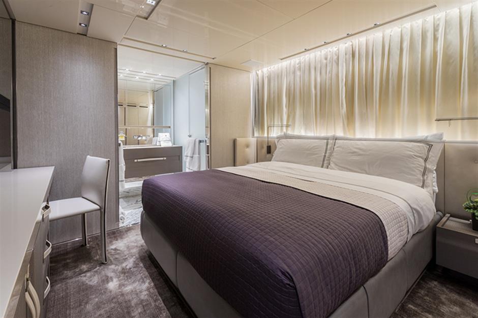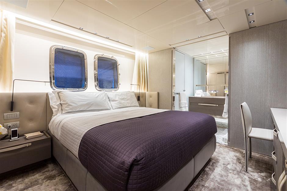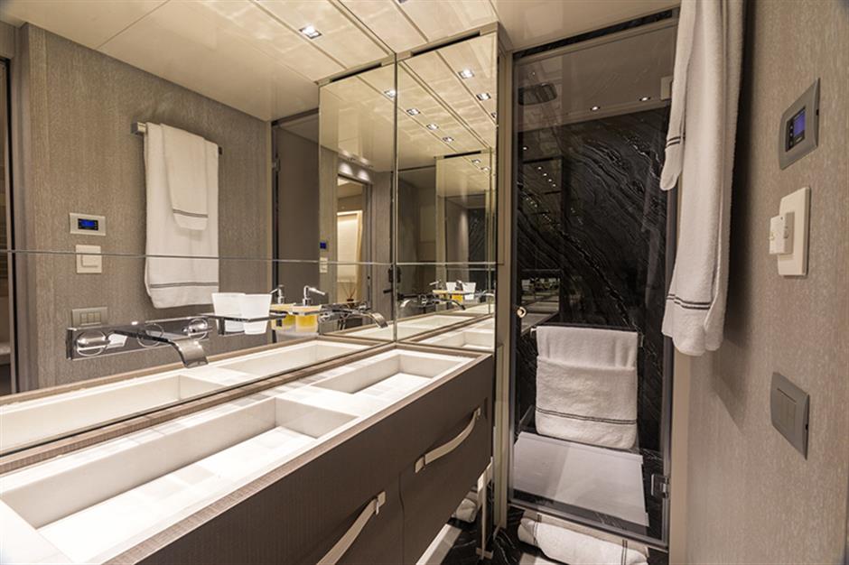 The master is large, bright, and airy with ample storage and a hanging locker. There are three-sided windows which offer light, air, and a wonderful view. Headed aft from the master one will reach the four guest staterooms from the stairway below. Down the stairs, one will land in the guest foyer. Going aft from the guest foyer one will find two identical queen berth cabins with ensuite, ample storage, and hanging. Going forward from the guest foyer one will find two additional cabins, one to port with a queen berth that can split to make twins and one to starboard with a twin cabin, both with ensuite, ample storage, and hanging. The master and all guest cabins are well-appointed with beautiful stonework and décor as well as state-of-the art entertainment.