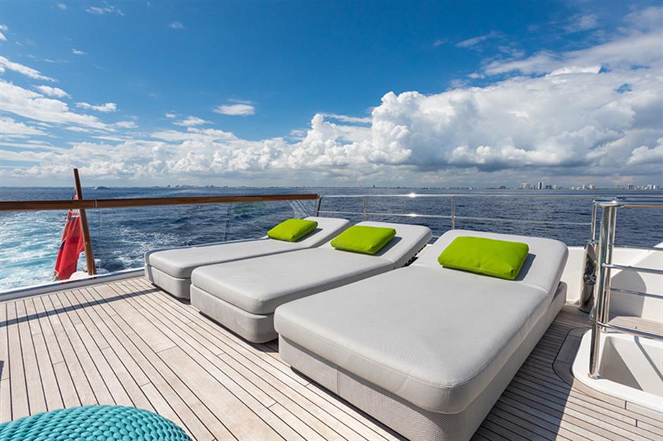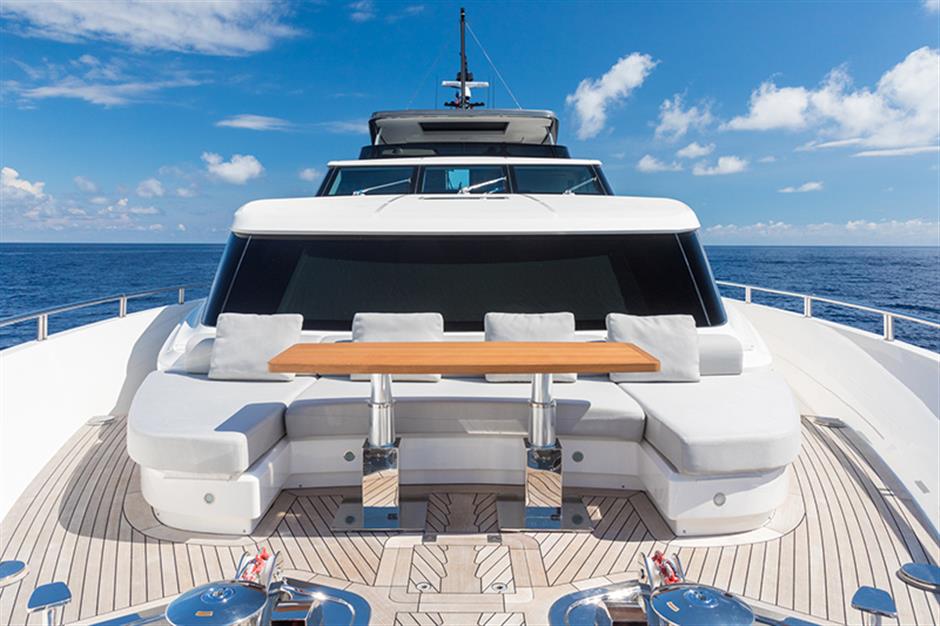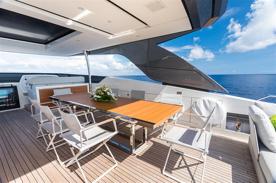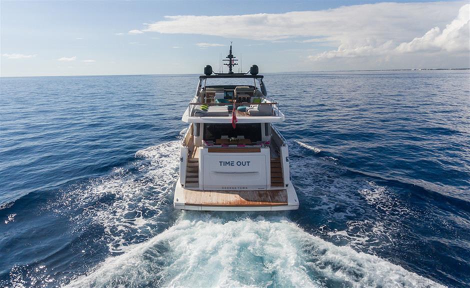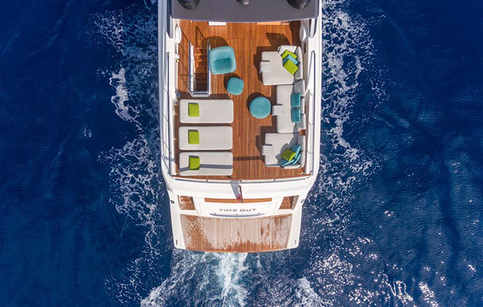 When one arrives to the aft deck of TIME OUT one will find a spacious deck area with an aft built-in settee plus two tables that come together to make one with additional seating for dining when needed. You can go down the steps from either side of the settee to reach the large stern/swim platform. This is a perfect area for watersports and makes for a safe and convenient place to get on and off the tender.