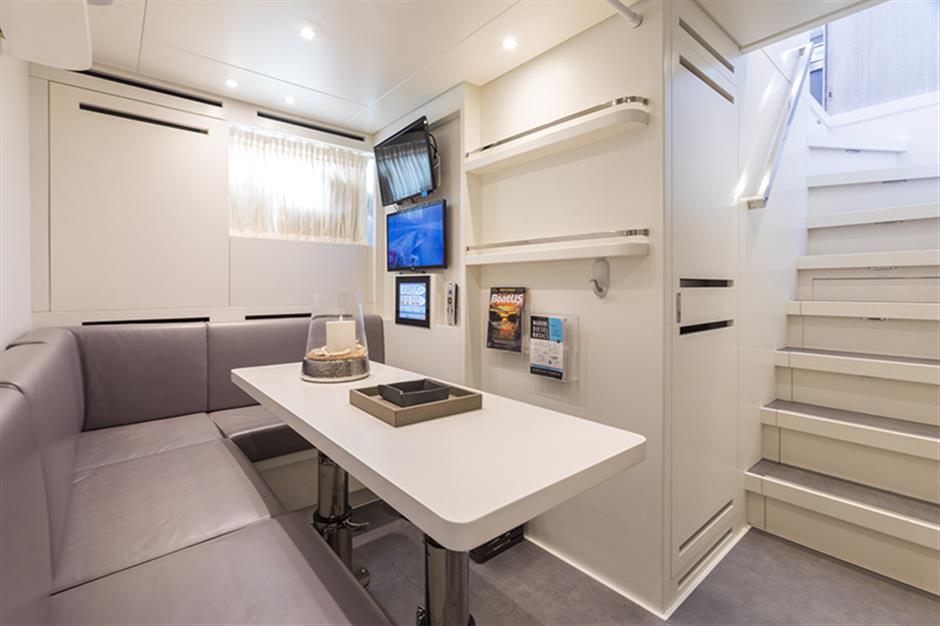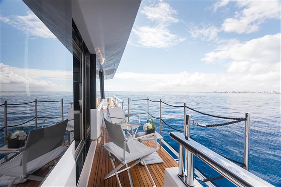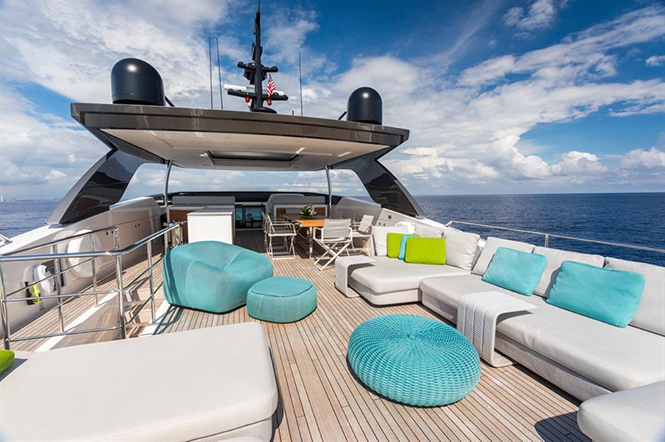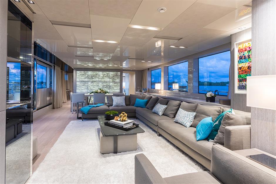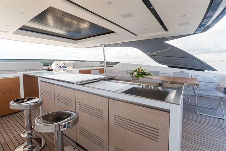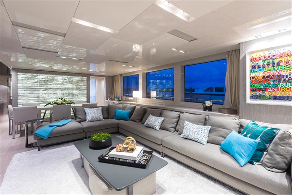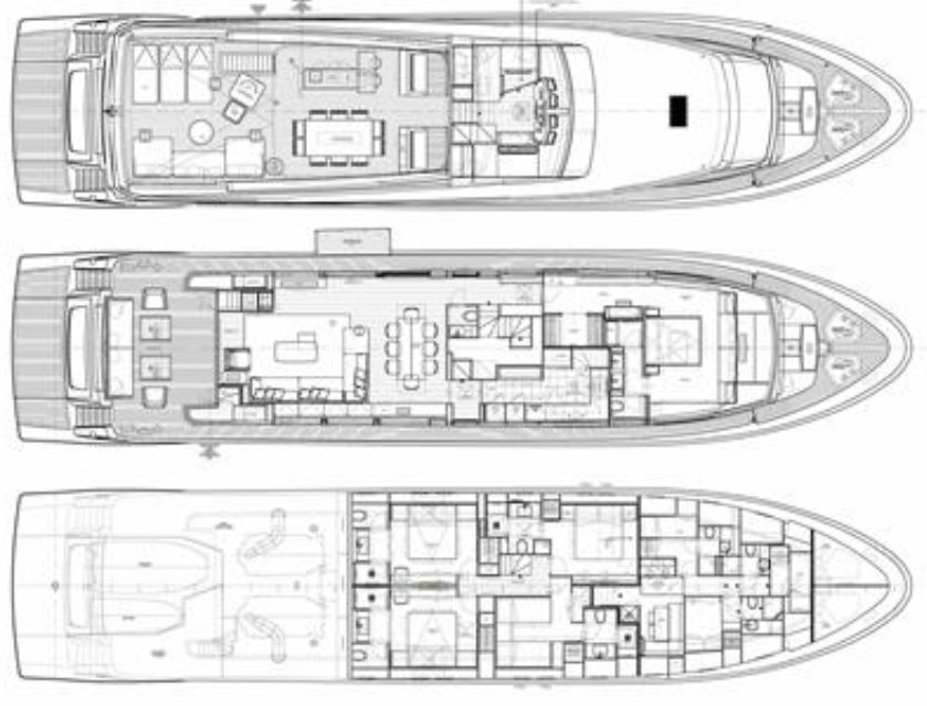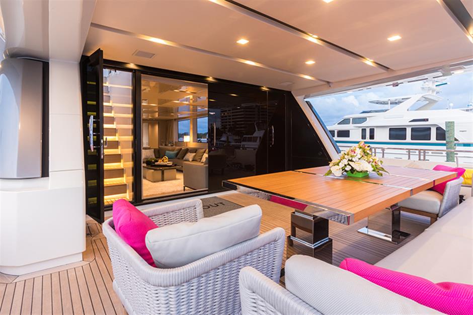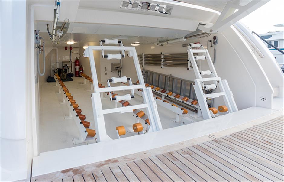 From the swim platform, one will have access to a garage area that is equipped to store a tender and jet ski and misc. water toys and dive equipment. From the aft deck, one will go through a doorway to enter the main salon or through a door just to port that allows quick access to the bridge deck.