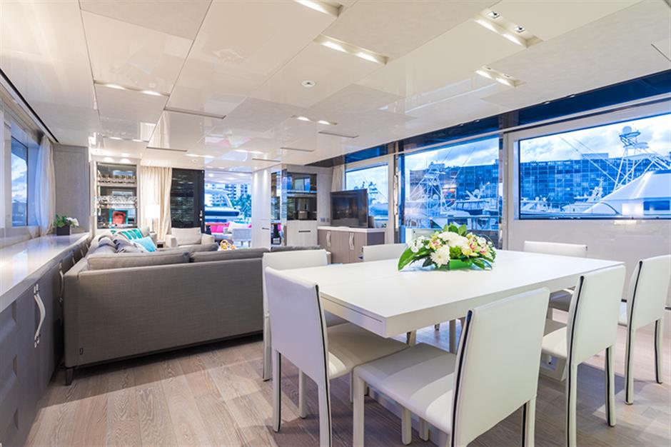 When entering the main salon on TIME OUT one will find a spacious open layout with a large L-shaped settee to starboard, a comfortable chair just aft, and a custom coffee table within. The TV for the main salon is in a pop-up built-in on port just aft of the double door that opens to the balcony. The large double door mentioned gives access to the port side deck and the custom balcony, perfect for watching the sunset or simply relaxing with a book. Forward is the dining area is a beautiful dining table for 8. The forward bulkhead is a gorgeous back lite white Carrera marble with a carved design, which is ideal for the space.