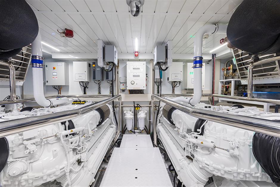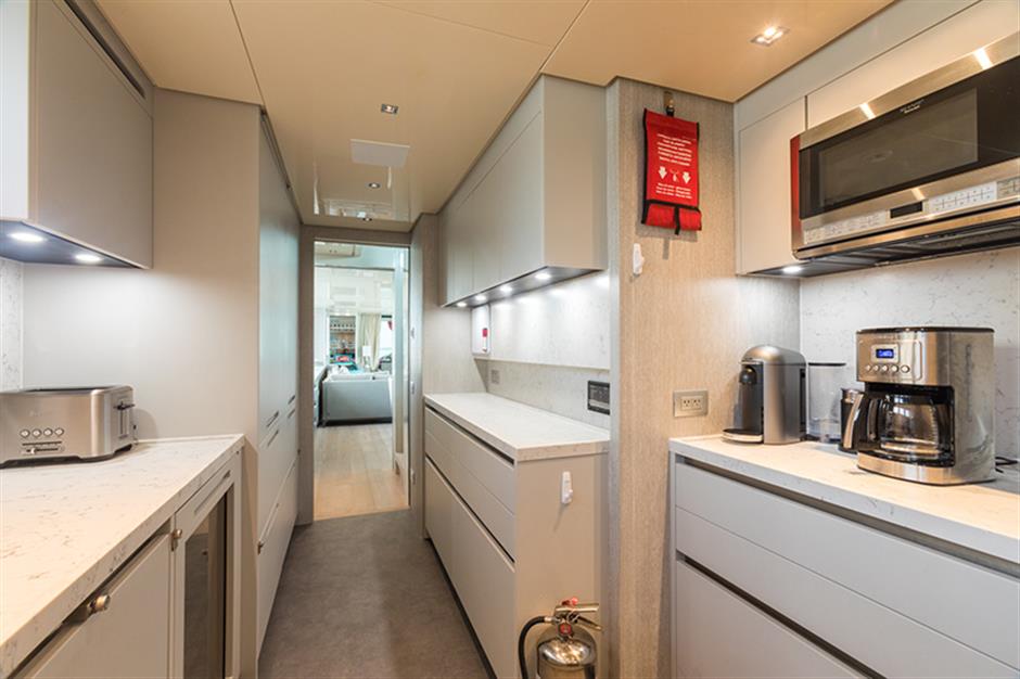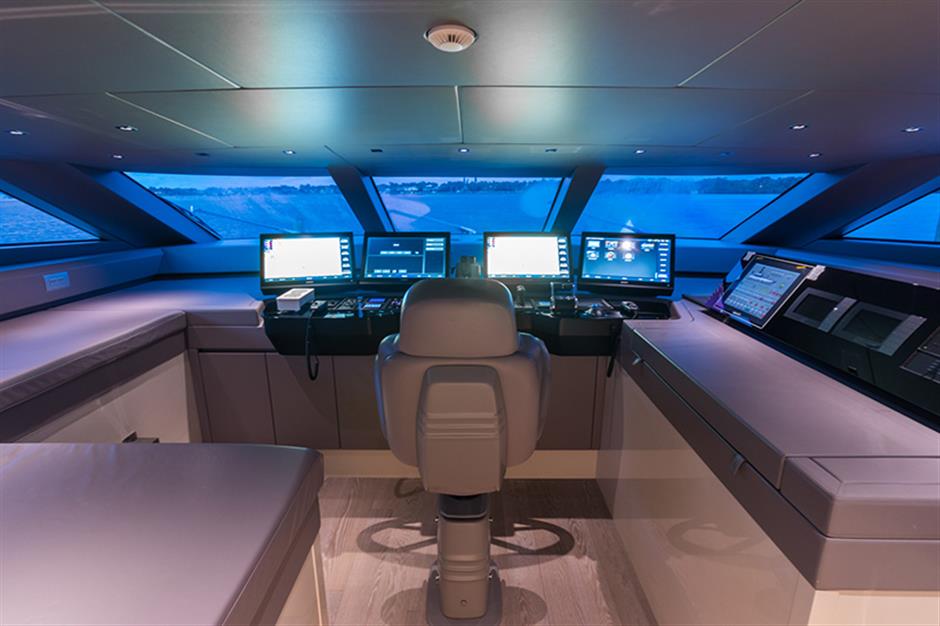 Back in the main salon, one will go forward to starboard to find the formal entry foyer. Here one will go up to the pilothouse where one will find a spacious area with a settee, captain’s chair, and state- of the art navigation and communication equipment. From the formal foyer forward, one will find a galley with all the latest equipment. Continuing through the galley one will reach the crew quarters for 5.