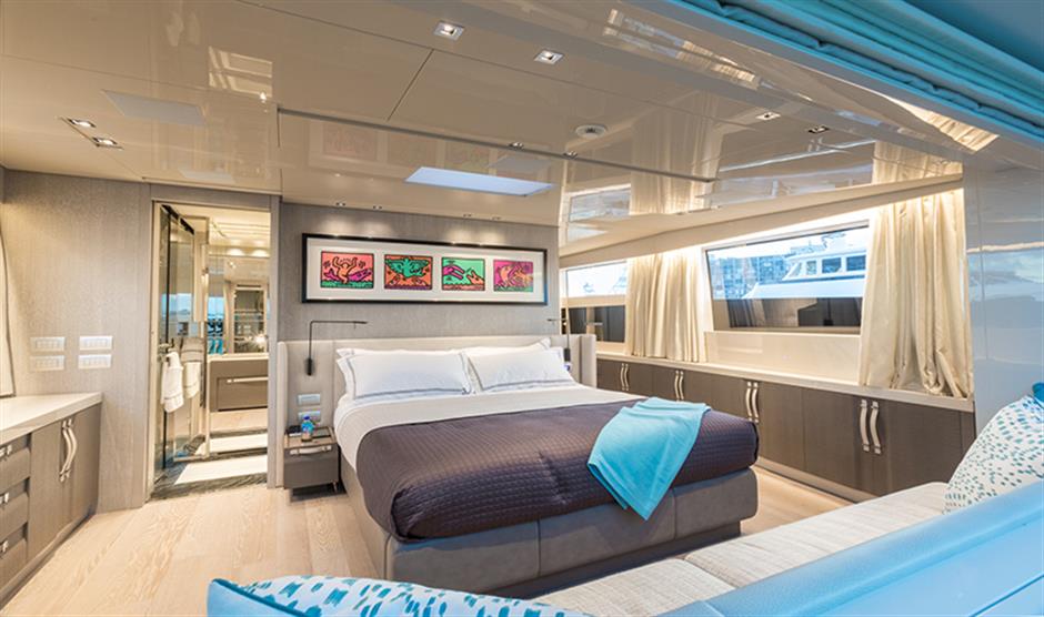 You can reach the open bridge deck from the pilothouse or from the aft deck stairs. Once on the bridge deck, one will find a large spacious area with high-quality furniture including a large settee, chairs, and tables as well as three loungers. Forward on the starboard side one will find a covered dining area for 10 and a bar to port with 2 stools. Within the bar, one will find a fridge, icemaker, and storage. TIME OUT is a great example of a beautiful Italian yacht with a gorgeous interior and all the amenities one could need