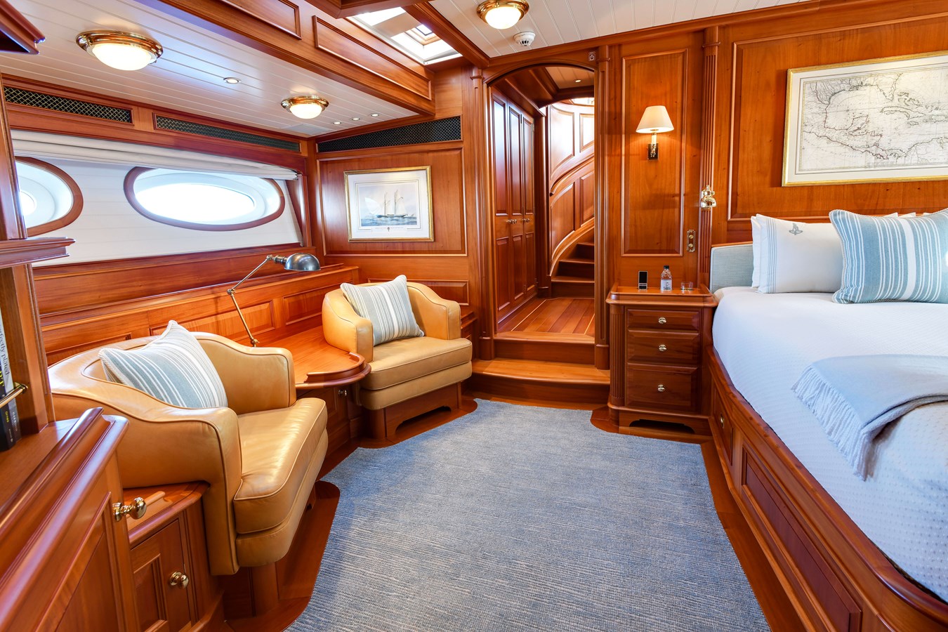 The yacht's exterior and naval architecture were meticulously overseen by Hoek Design, a team renowned for their expertise in classic yacht styling. This collaboration resulted in a sloop-rigged configuration, featuring in-boom furling and carbon spars supplied by Southern Spars, complemented by new North 3di sails in '24. s/y ANNE is optimized for push-button sailing with Rondal captive winches and Reckman headsail furling systems, ensuring optimal performance with minimal crew.