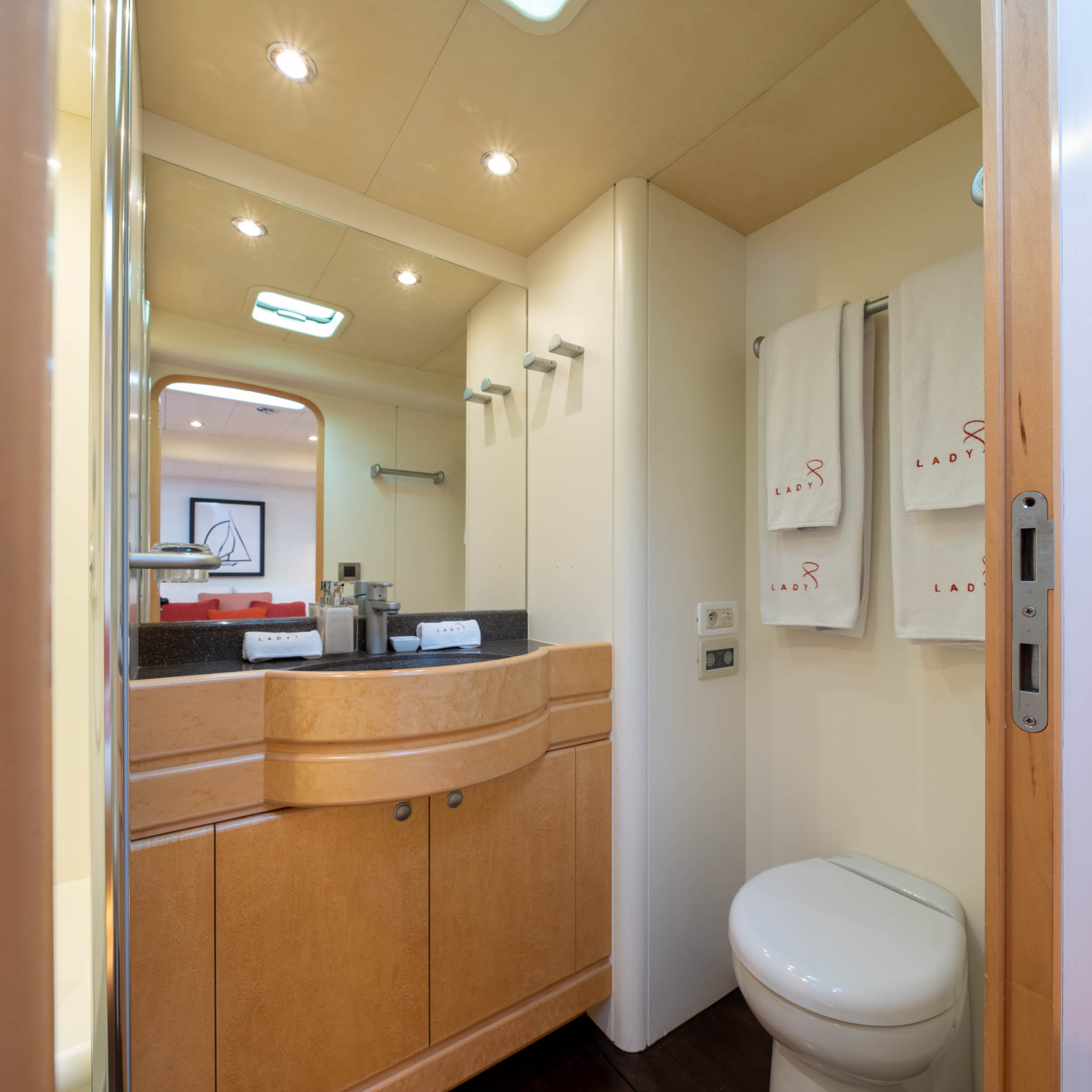 Lady 8 has a wonderful raised deck saloon with virtually a 360 degree view across the decks and out to sea. This being a particularly nice feature as opposed to being in a more typical below decks saloon with no visibility of your surroundings. The saloon has a large U shaped sofa and seating around an excellent dining table to port (sleeping 8+ guests). To starboard is an additional sofa and lounging area next to the large Television and bar area. Walking forward from the saloon you enter the guest area and the guest 3 cabins.