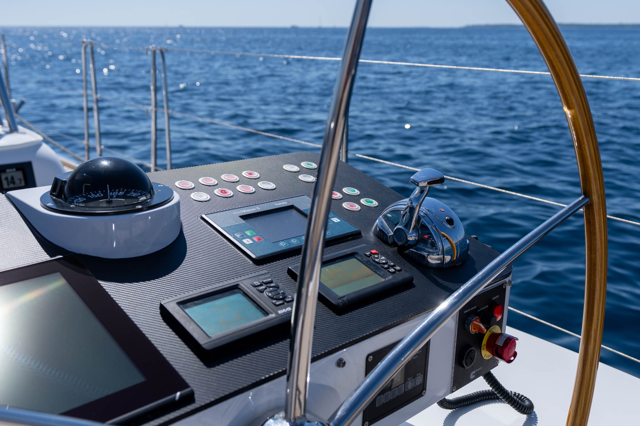 In 2023 the yachts Navigation station below deck was entirely re-newed and re-designed. Modernising outdated equipment and fitting latest navigation aids. Each cockpit helm station has been completely overhauled with new electric button switching and carbon dash fascia.