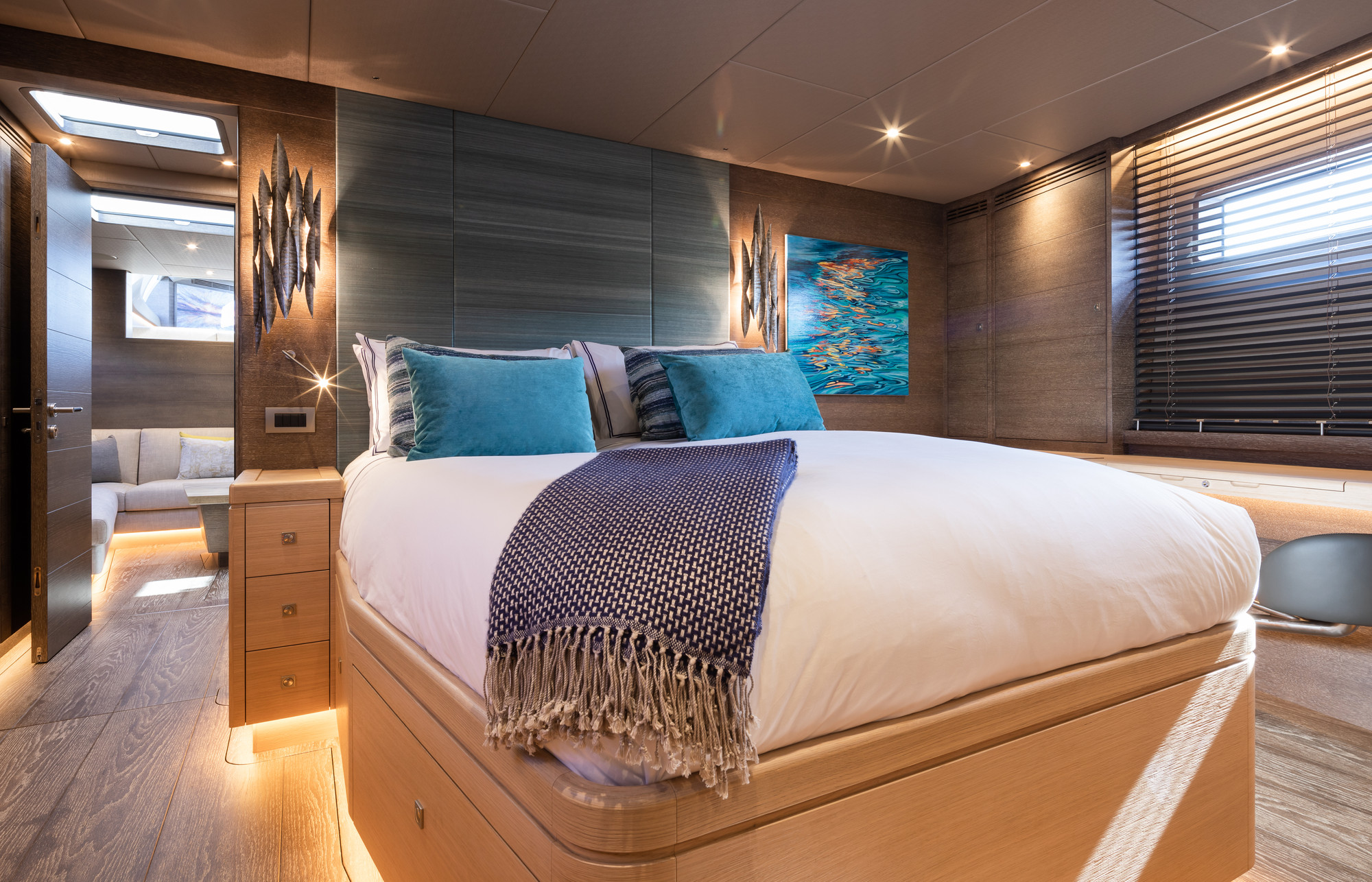 Liara sleeps 8 guests in 4 luxuriously appointed ensuite cabins. Consisting of the owners double suite forward, a double VIP cabin midships and two twin cabins aft of the saloon. There are also 3 dedicated crew cabins aft which sleep 5 in total. The beautiful interior, by Adam Lay Studios, reflects the owner's love of the natural environment; utilizing calm, high-quality limed and stained oak joinery throughout the yachts unusually spacious accommodation.