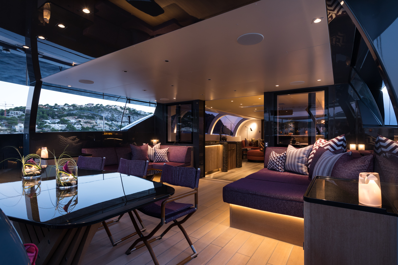 The deck saloon is laid out to incorporate informal seating and a pop-up television to port, with formal dining to starboard and a seated bar – all affording superb visibility and comfort.