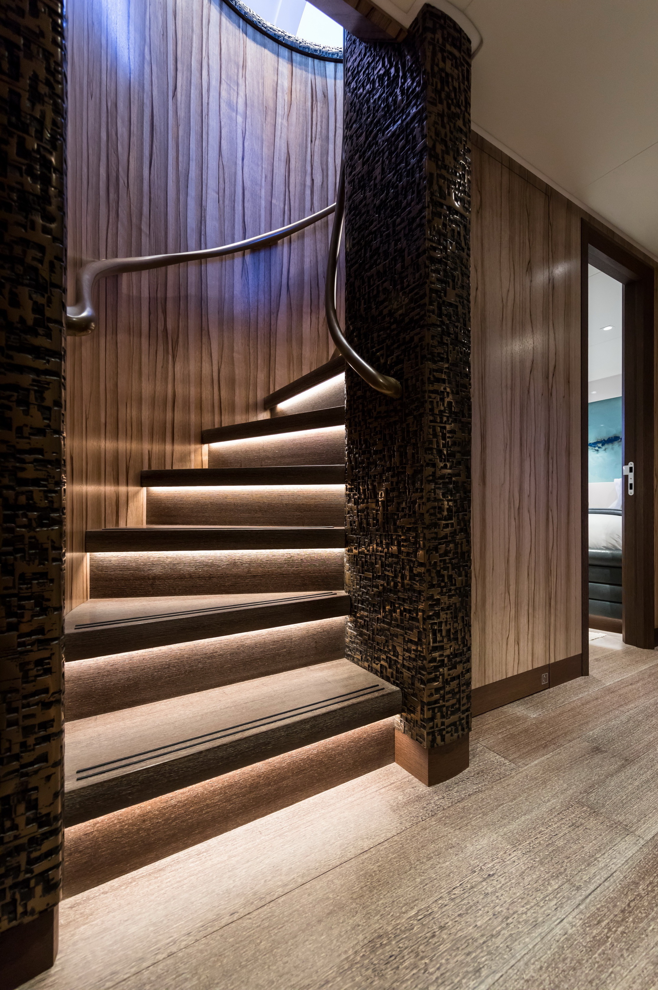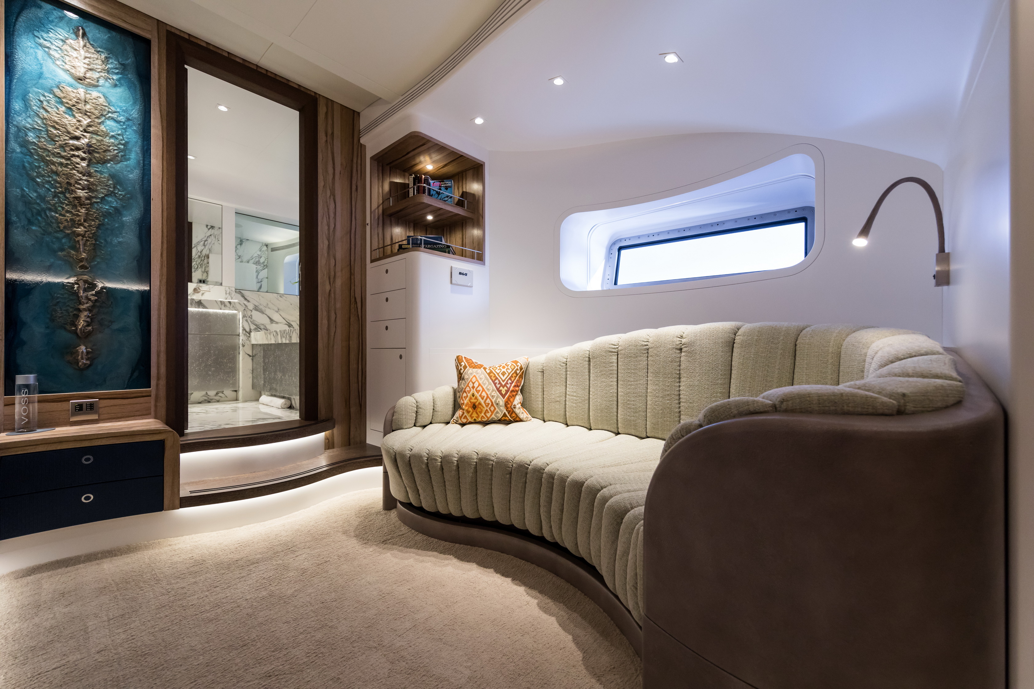 Ngoni's modern, organic and curved interiors, designed to echo the yacht's exterior lines, are by British designer Rick Baker. Her ceiling panels, sofas, blinds and curtains are by Zijlstra, with furniture, wall panels, headboards and leather work by Cools Upholstery and special wall panels commissioned by Officina Coppola, an English company specialising in custom finishes and art panels of resin, metal and limestone.