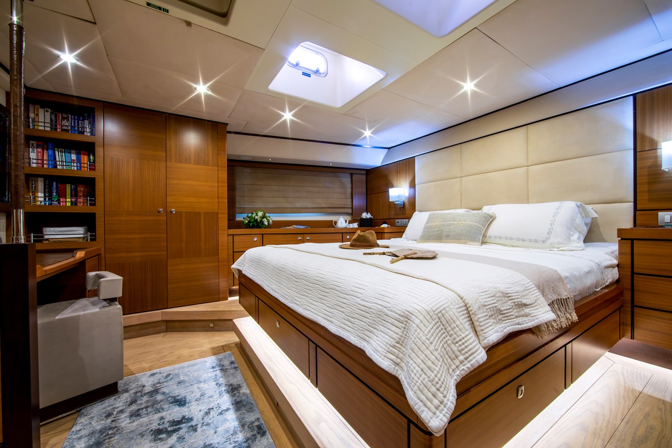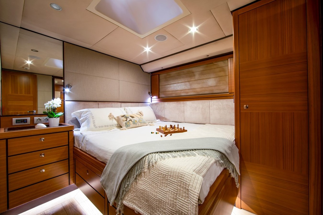 Inside, PATEA offers a spacious deck salon with 360-degree views through large picture windows and deckhead skylights. The interior features satin-finished light oak floors and American walnut cabinetry, creating a warm and inviting atmosphere. The salon can be arranged as a full lounge area or a dining room, with an internal helm station that doubles as a bar. Below deck, she sleeps up to eight guests in four cabins, including a full-beam owner’s suite, a double cabin, a convertible cabin, and an additional en-suite cabin that can also serve as a TV lounge. The thoughtful configuration ensures optimal privacy and functionality, with separate crew and guest areas.
