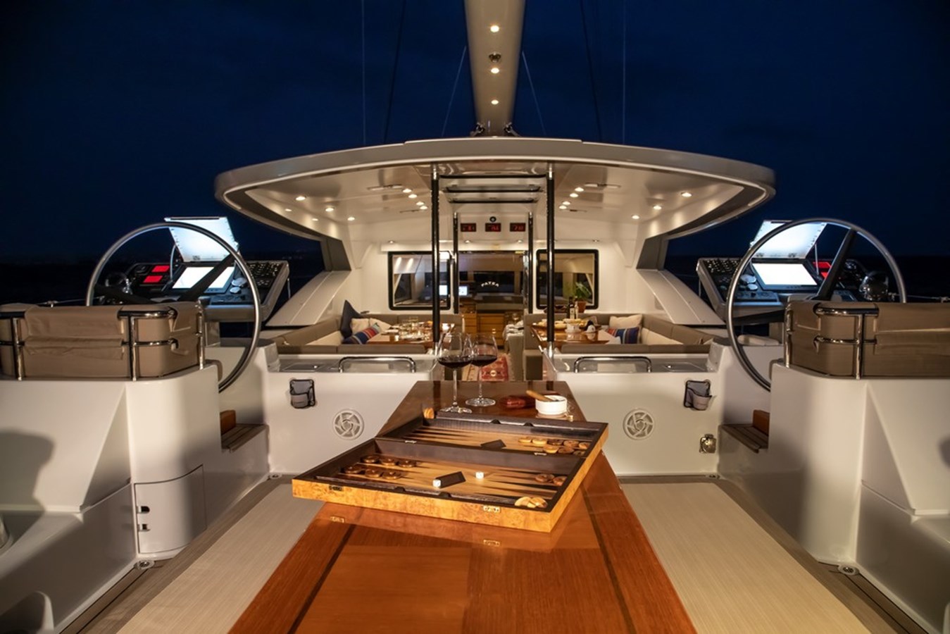 PATEA’s deck layout is designed with both leisure and sailing efficiency in mind. The line-free guest cockpit, shaded by an extended coachroof with skylights, offers open-air dining for 8-10 guests at anchor and a safe space to enjoy sailing underway. The area also features a 32-inch pop-up TV for movie nights under the stars. Aft, the elevated helm stations provide excellent steering positions with push-button sail-handling controls for easy navigation.