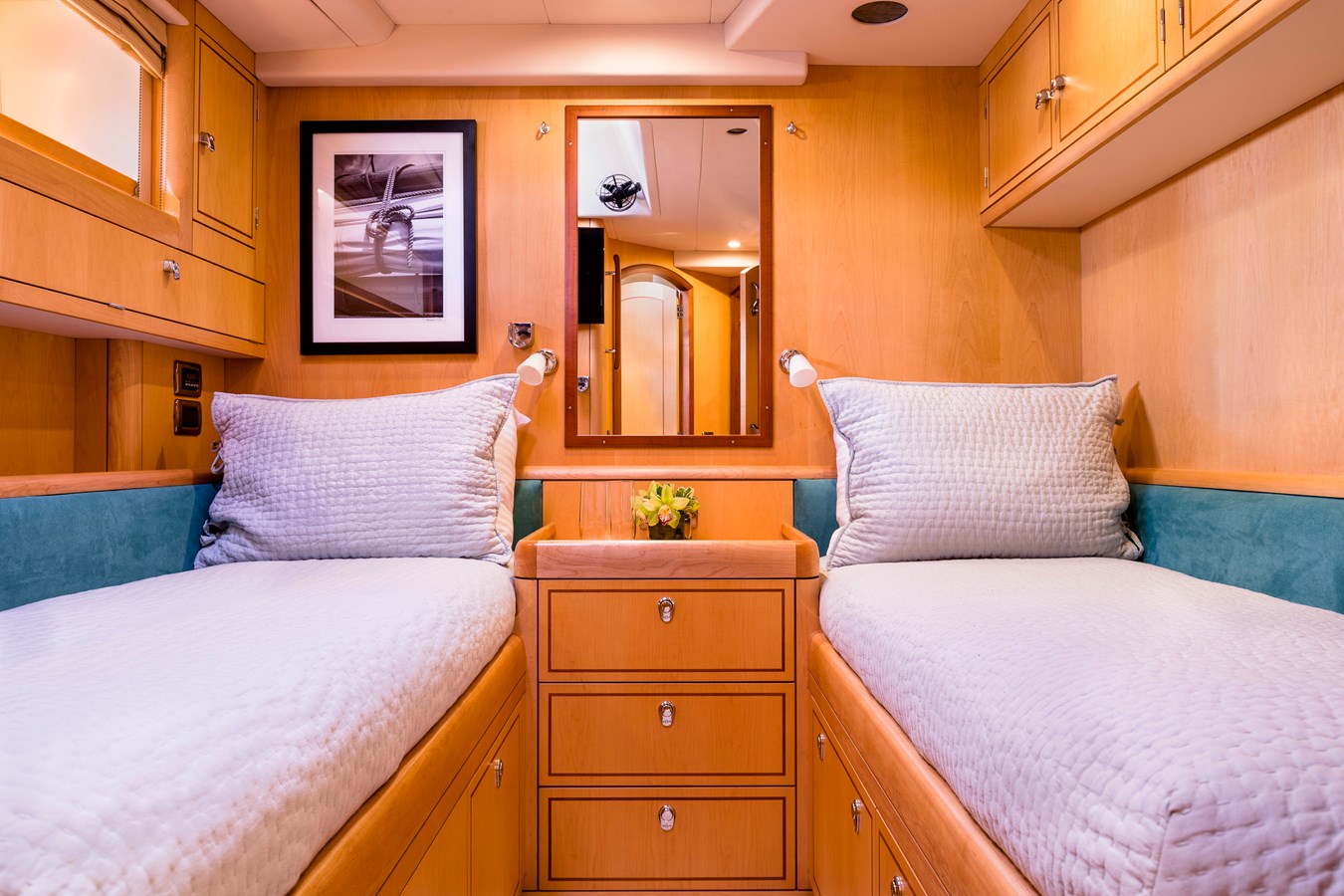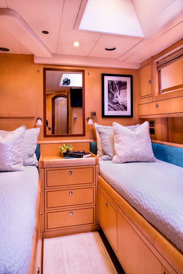 Her interior features maple joinery with rich mahogany accents, beautiful teak floorboards and plush upholstery, all of which combine to accentuate the light, airy interior. Her upper salon and nav area offer expansive views via the deck saloon windows. The equally inviting lower saloon serves as a breakfast nook, reading and lounge area. Her three generous en-suite guest cabins, equipped with hideaway pipe berths for additional accommodations. New satin finished hardwood floorboards provide the finishing touch that sets RAVENCLAW apart from her sisterships. Generous crew quarters and galley forward naturally provide privacy and separation while ensuring the boat is configured for silver service.